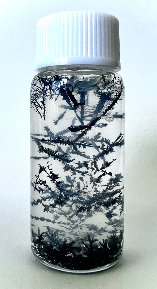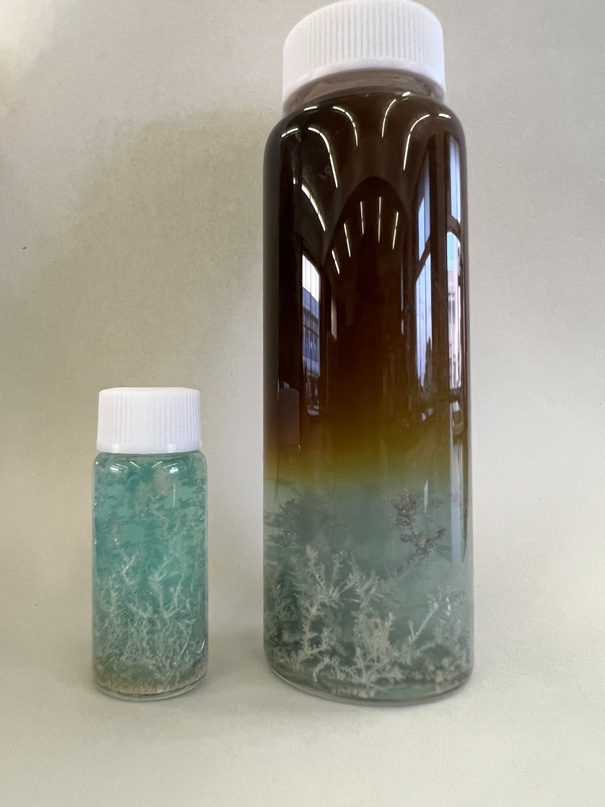 従来の試験管内で金属樹を作る方法は、振動により金属樹の崩壊が起きやすいが、高さ5cmの小さなボトルと寒天を用いることで金属樹が固定され、立体的な金属樹を作成することが可能となります。