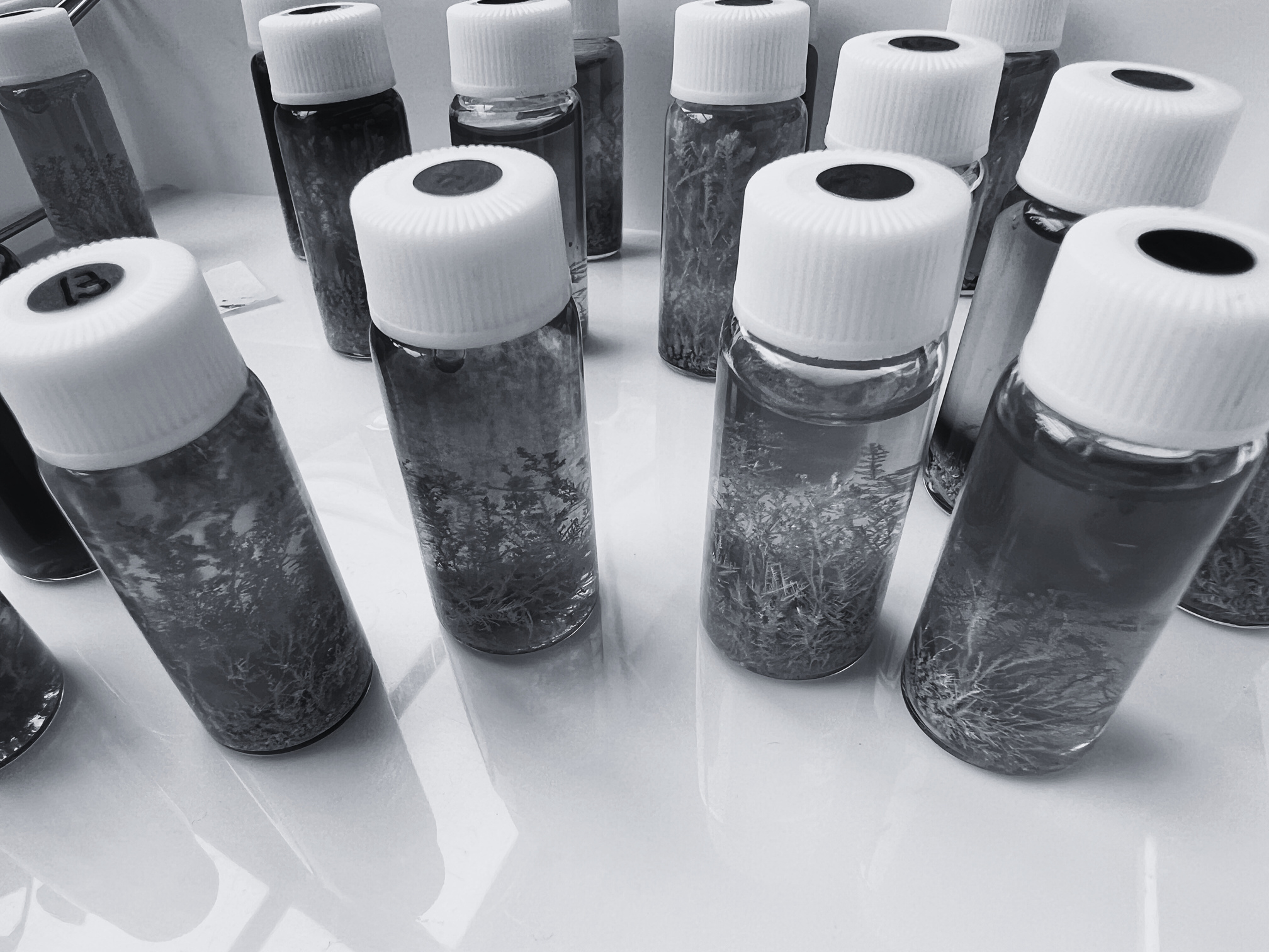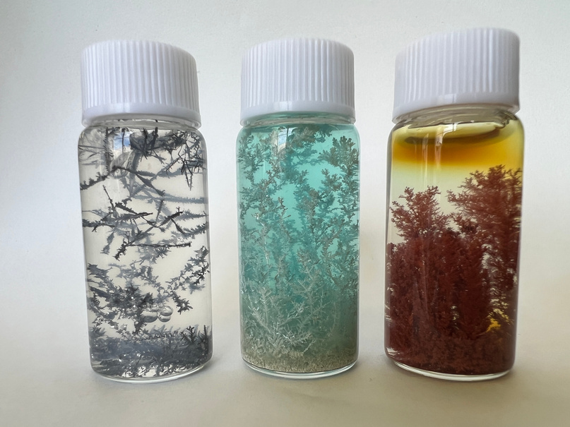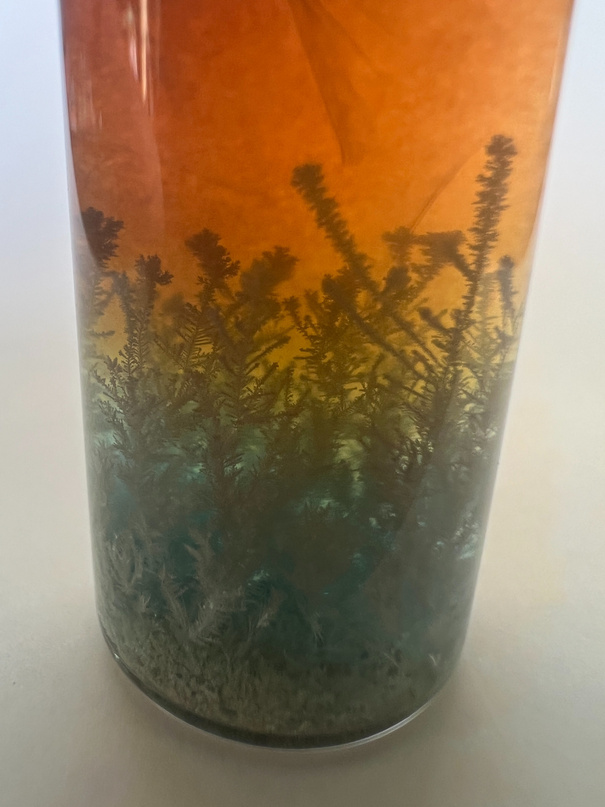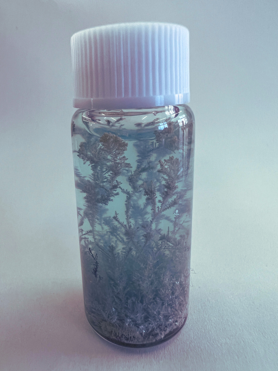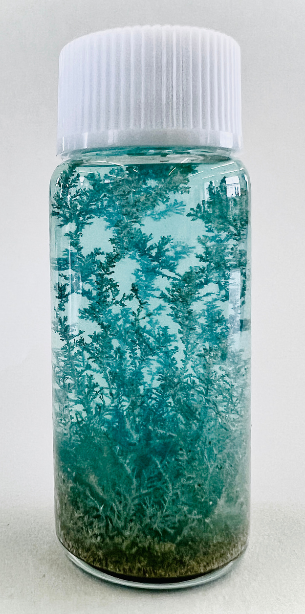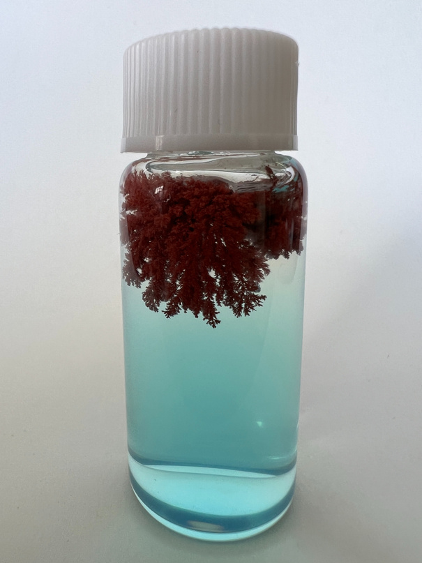金属樹の生成には数日要すします。なお、褐色部分が現れることもありますが、銅イオンのはたらきにより次第に液は淡青色になり、透明度が増していきます。