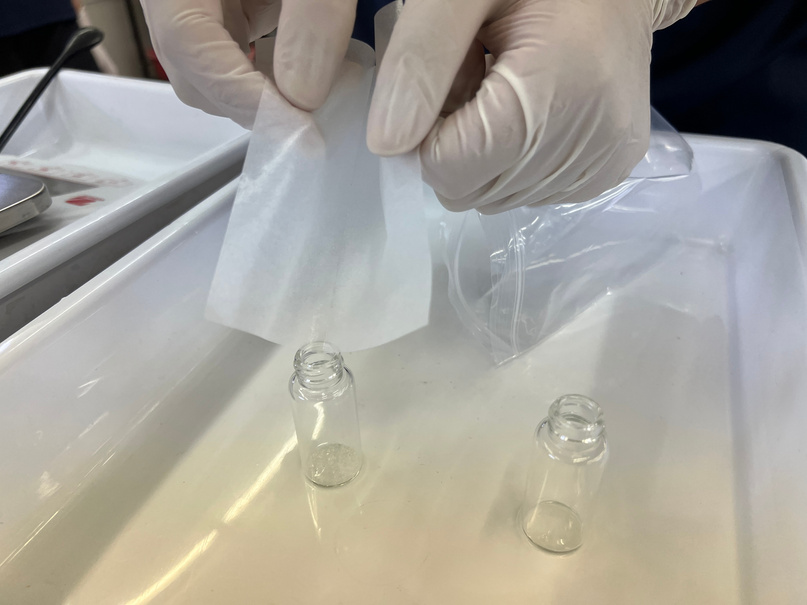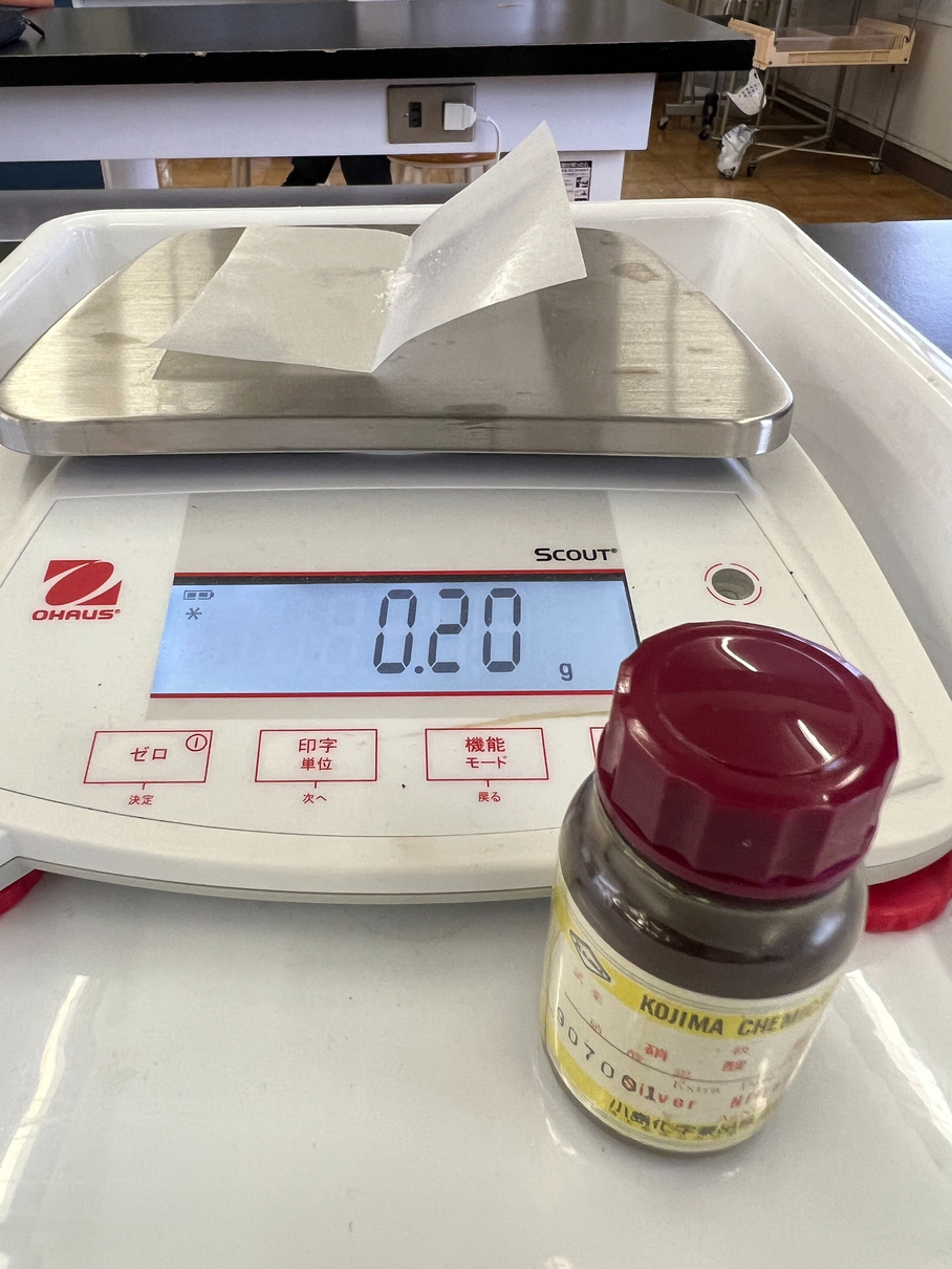皮膚に触れると生成された銀が皮膚に入り込み、黒く変色してしまうので、必ず保護メガネとビニール手袋をして実験を行いましょう。