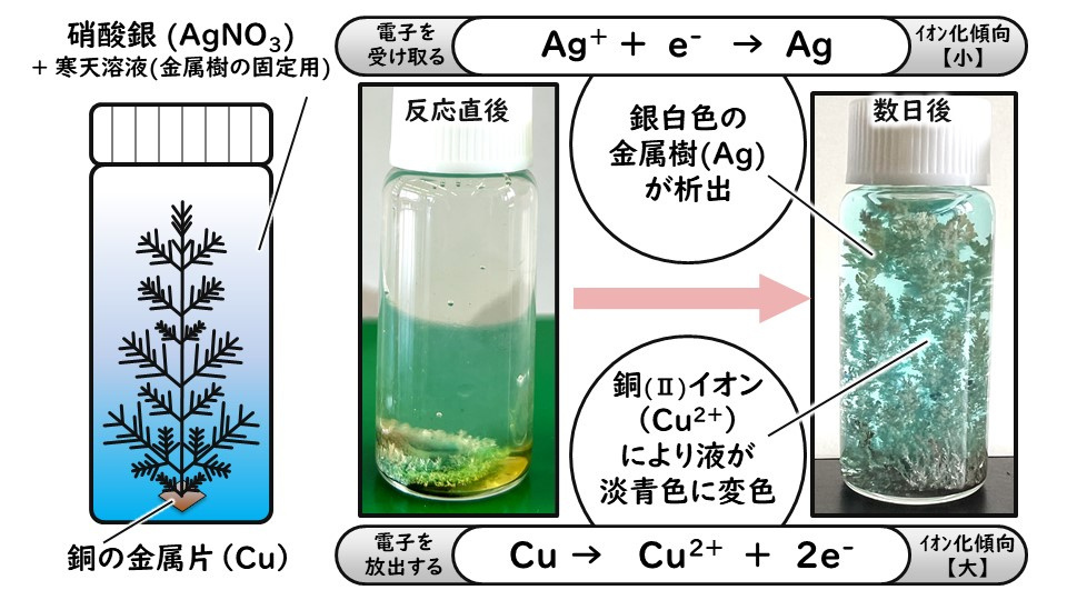 これは、硝酸銀を溶かした寒天溶液に銅を入れることで、イオン化傾向のはたらきにより銀が金属樹として析出することを利用した教材です。